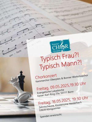 Unter dem launigen Motto „Typisch Frau?! Typisch Mann?!“ stellen wir uns gemeinsam mit dem Bonner Workshopchor dem vieldiskutierten Thema der Geschlechtergerechtigkeit auf musikalische Art und Weise.