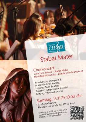 Der Kammerchor Oberpleis, der AUDIENDA-Chor Krefeld sowie die Covestro Symphoniker Krefeld laden Sie herzlich ein zu einem musikalischen Hochgenuss. Freuen Sie sich auf Rossinis „Stabat Mater“ und Moniuszkos „Litania Ostrobramska III“ in der Bonner Michaelskirche.